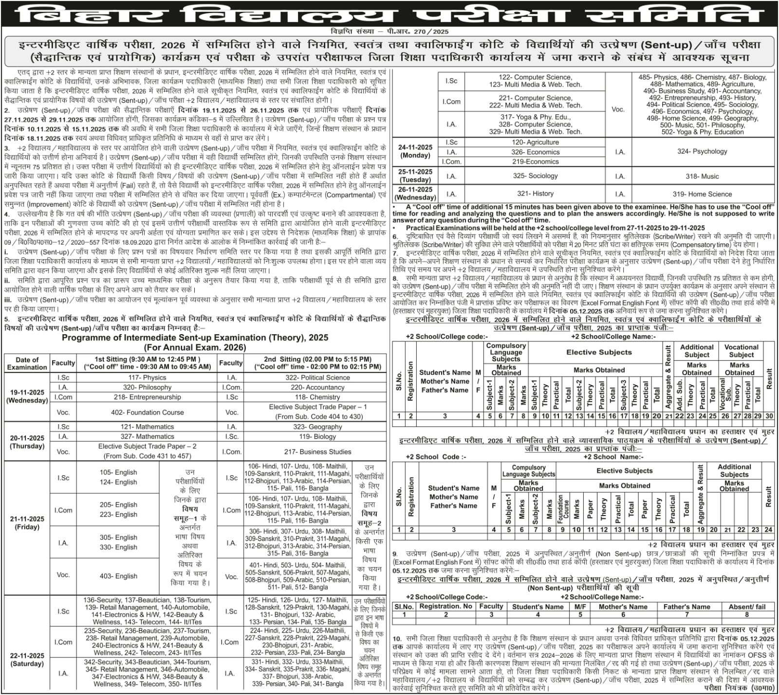 बिहार बोर्ड इंटर (Arts, Science, Commerce & Vocational) की सेंटअप परीक्षा 19 नवंबर 2025 से 26 नवंबर 2025 तक आयोजित की जाएगी।