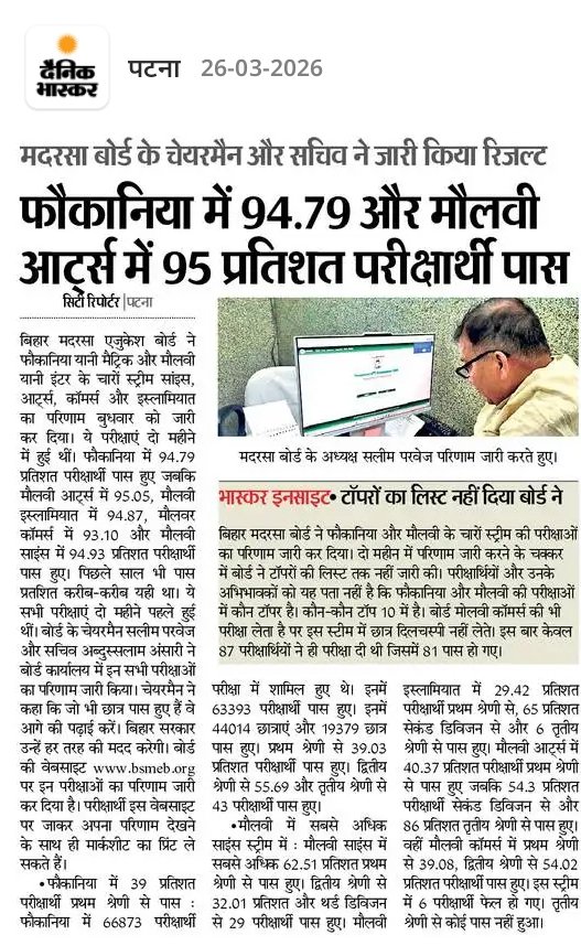 बिहार स्टेट मदरसा एजुकेशन बोर्ड (BSMEB) ने Foqania और Moulvi परीक्षा का रिजल्ट आधिकारिक वेबसाइट पर जारी किया है।