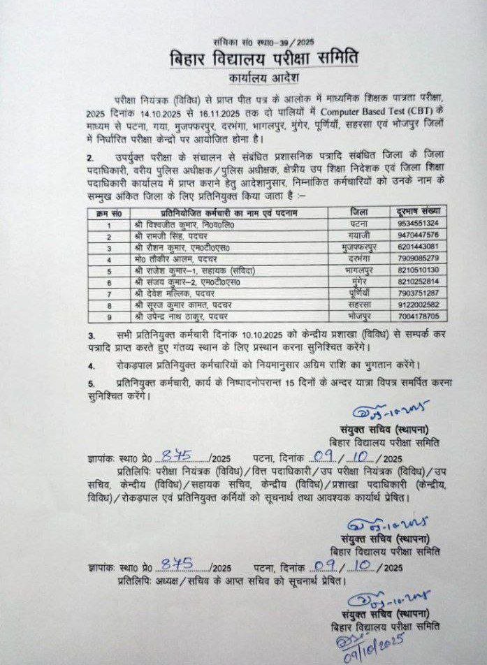 बिहार विद्यालय परीक्षा समिति ने एडमिट कार्ड जारी करने से पहले परीक्षा से जुड़ी तमाम जानकारी दे दिया है, जिसमें यह भी स्पष्ट कर दिया हैं कि परीक्षा 14 अक्टूबर 2025 से 16 नवंबर 2025 तक होगी। इसके साथ ही साथ सभी परीक्षा केंद्र कि भी जानकारी दे दिया हैं –