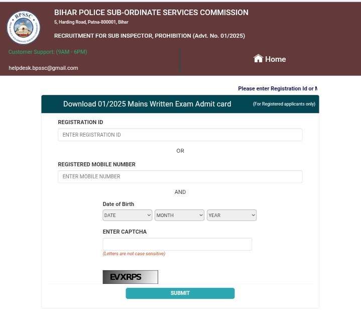 BPSSC SI Prohibition Mains Admit Card 2025 - अपना रजिस्ट्रेशन नंबर और जन्म तिथि दर्ज करें।