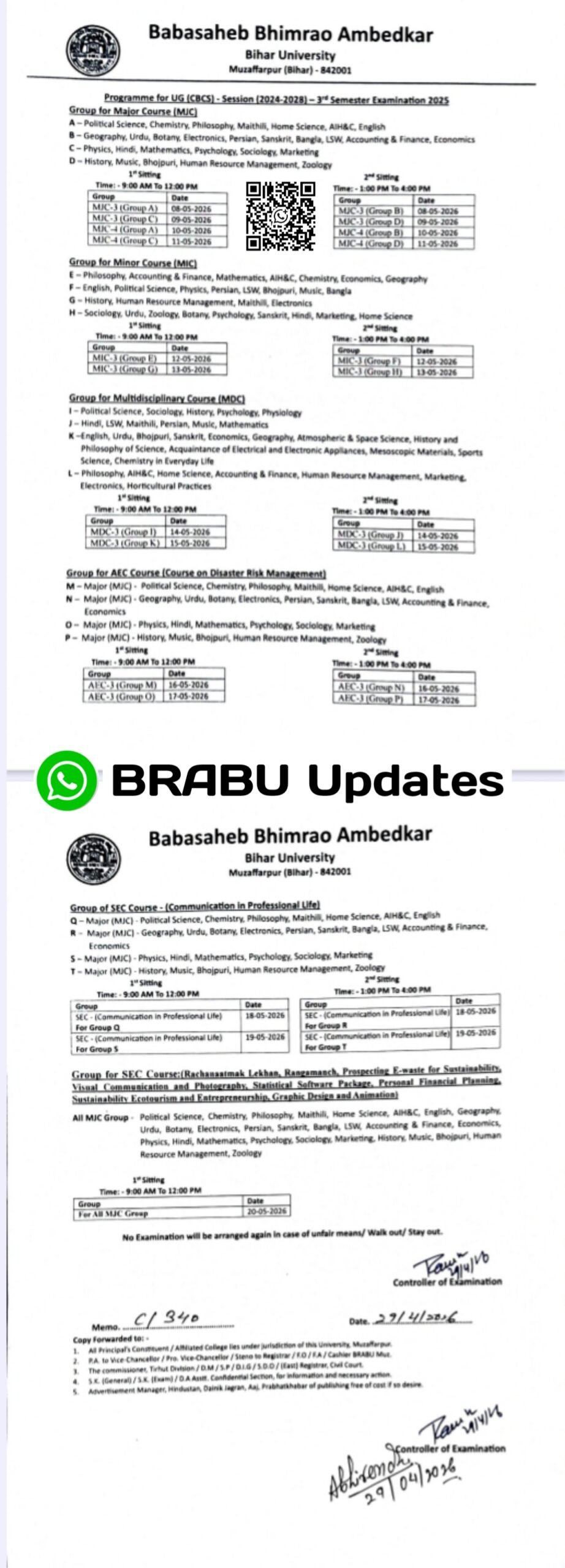 BRABU UG 3rd Semester Exam Date 2024-28