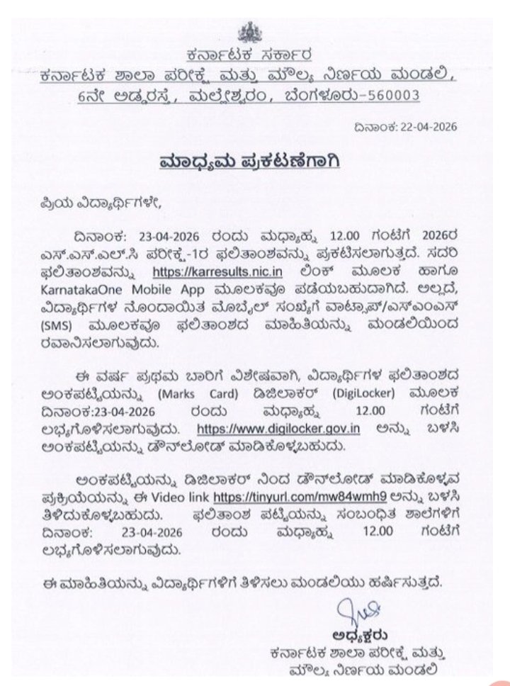 Karnataka SSLC Result 2026 का इंतजार खत्म हो चुका है। Karnataka School Examination and Assessment Board (KSEAB) ने आज 23 अप्रैल 2026 को दोपहर 12:00 बजे आधिकारिक रूप से SSLC (Class 10th) Result 2026 जारी कर दिया है। इस साल करीब 8.5 लाख से अधिक छात्रों ने परीक्षा में भाग लिया था, जो अब अपना रिजल्ट ऑनलाइन चेक कर सकते हैं।