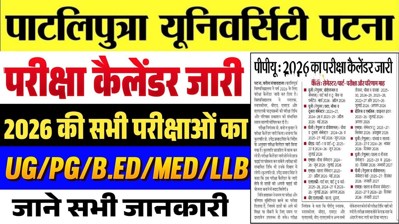 PPU Exam Calendar 2026: इंकलाब जिंदाबाद दोस्तों, पटलिपुत्र विश्वविद्यालय, पटना (Patliputra University – PPU) ने वर्ष 2026 के लिए परीक्षा कैलेंडर जारी कर दिया है। परीक्षा नियंत्रक प्रो. मनोज कुमार द्वारा जारी इस आधिकारिक कैलेंडर के अनुसार, UG, PG, Vocational, B.Ed, M.Ed और LLB कोर्स की परीक्षा तिथि और परिणाम जारी करने की संभावित माह-सारणियाँ घोषित कर दी गई हैं।
