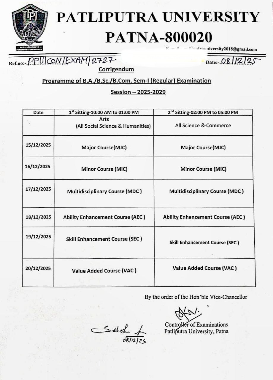 नीचे दी गई तालिका में Patliputra University, Patna द्वारा जारी परीक्षा कार्यक्रम का पूरा विवरण दिया गया है।
