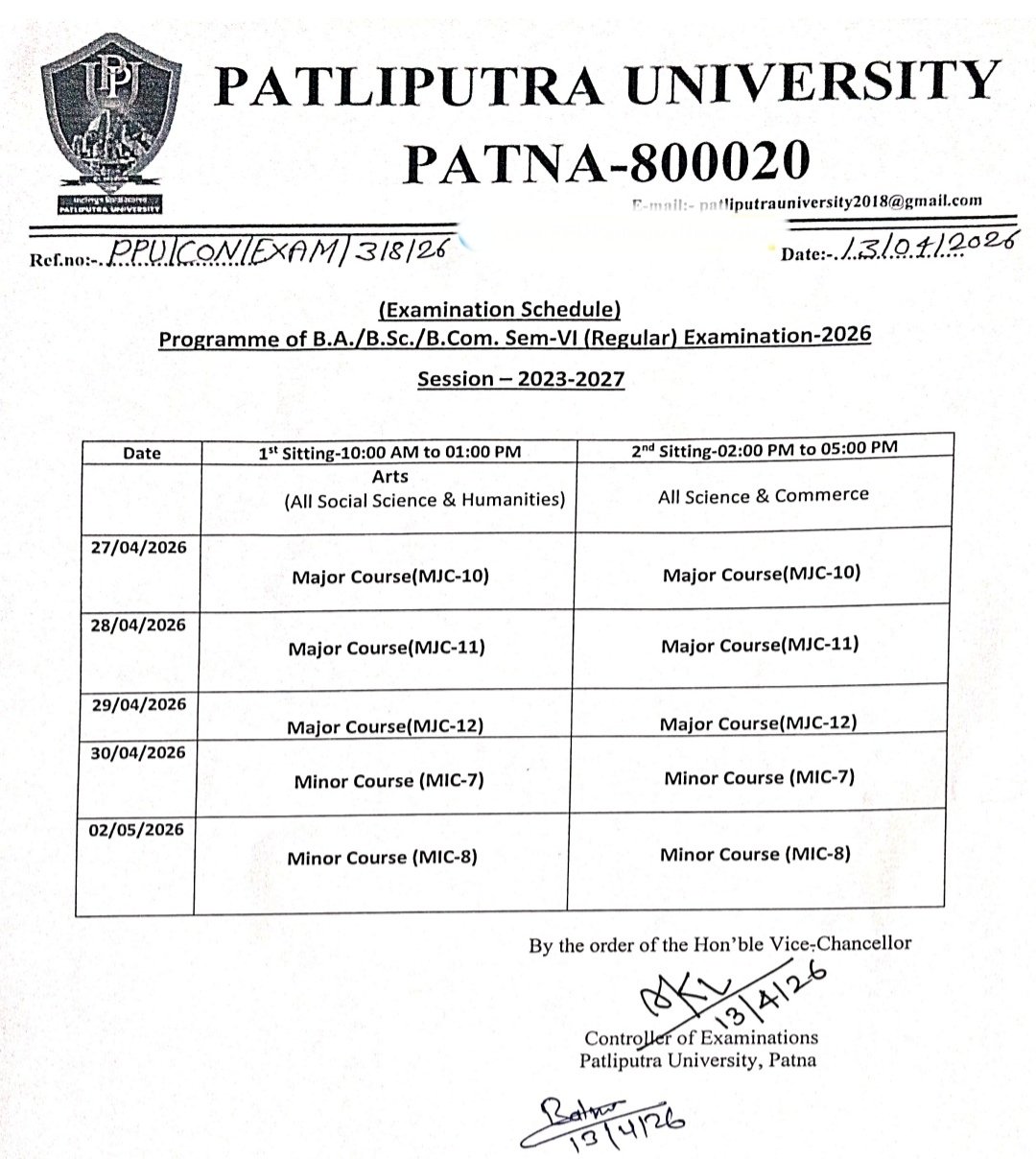 Patliputra University द्वारा जारी नोटिस के अनुसार, BA, BSc, BCom Sem 6 Exam 2026 की तिथि निम्नलिखित है: