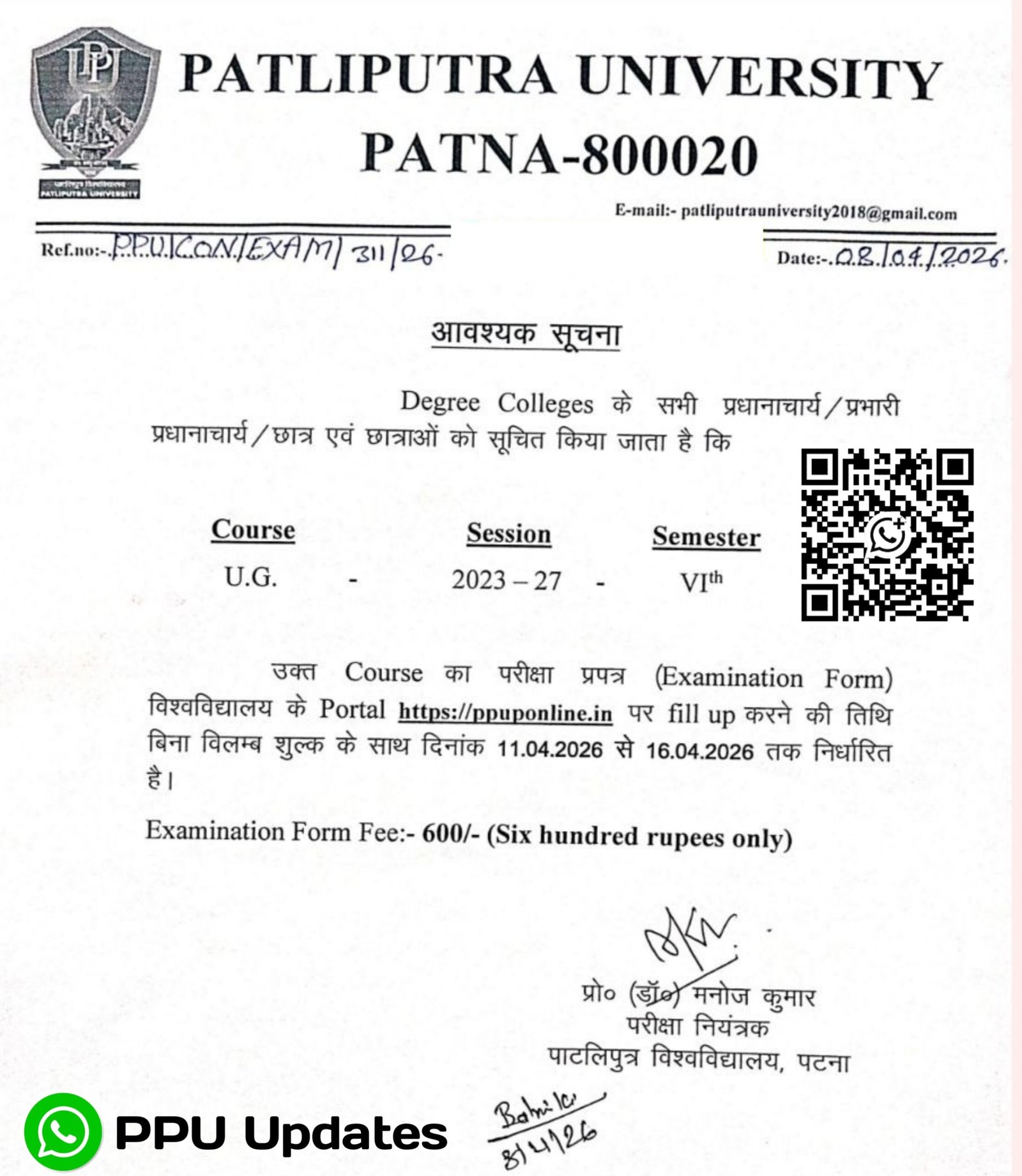Patliputra University के अनुसार UG Semester 6 के छात्रों के लिए Exam Form Fill-Up 11 अप्रैल 2026 से शुरू होकर 16 अप्रैल 2026 तक चलेगा।