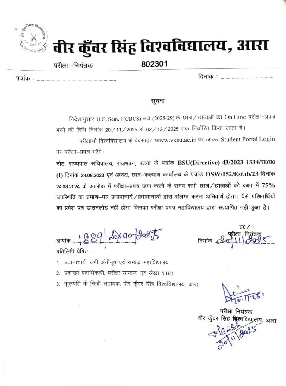 VKSU ने स्पष्ट निर्देश दिया है कि सभी विद्यार्थी Student Portal Login के माध्यम से ही अपना परीक्षा फॉर्म भरेंगे। इस बार राज्यपाल सचिवालय एवं छात्र-कल्याण विभाग के दिशानिर्देशों के अनुसार, परीक्षा फॉर्म जमा करते समय 75% कक्षा उपस्थिति का प्रमाण-पत्र संलग्न करना जरूरी है। जिन छात्रों की उपस्थिति 75% से कम होगी, उनका फॉर्म कॉलेज द्वारा सत्यापित नहीं किया जाएगा और ऐसे छात्रों का Admit Card डाउनलोड भी नहीं होगा, यानी वे परीक्षा में बैठने योग्य नहीं माने जाएंगे।